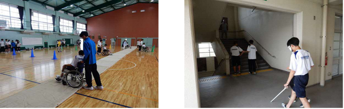 学校の福祉体験授業のお手伝いとして山田東中学校で車イス体験やアイマスク体験授業の補助活動をしています。